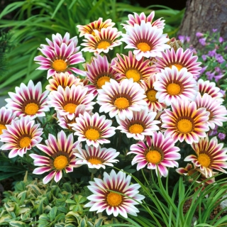 If growing Gazania seeds in colder climates, start the flower seeds indoors 6 - 8 weeks before the last expected frost. Treasure Flower seeds should be pressed into the soil but not covered and kept moist but not saturated until germination occurs. After germination of the flower seeds, reduce watering and grow seedlings in a sunny window location. For warm climates, start the Gazania seeds directly outdoors in a prepared seedbed. Space the ground cover seed 8 - 12 inches apart in the seedbed.