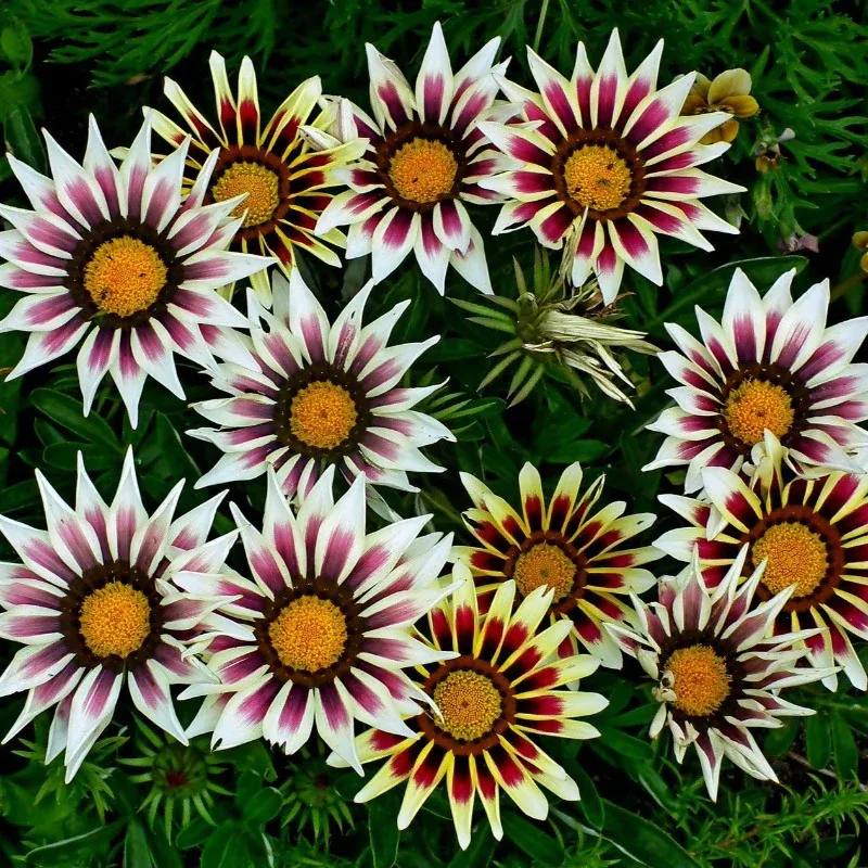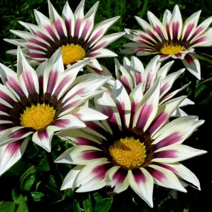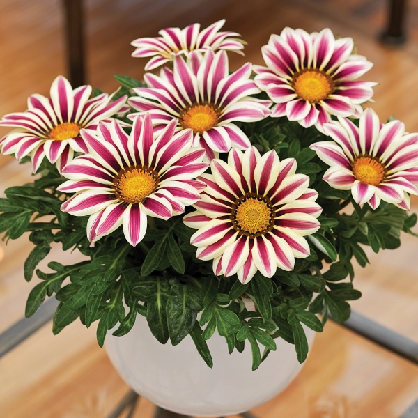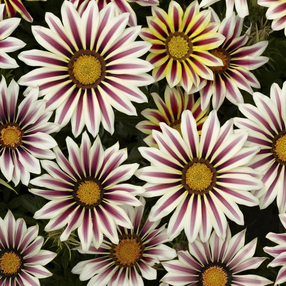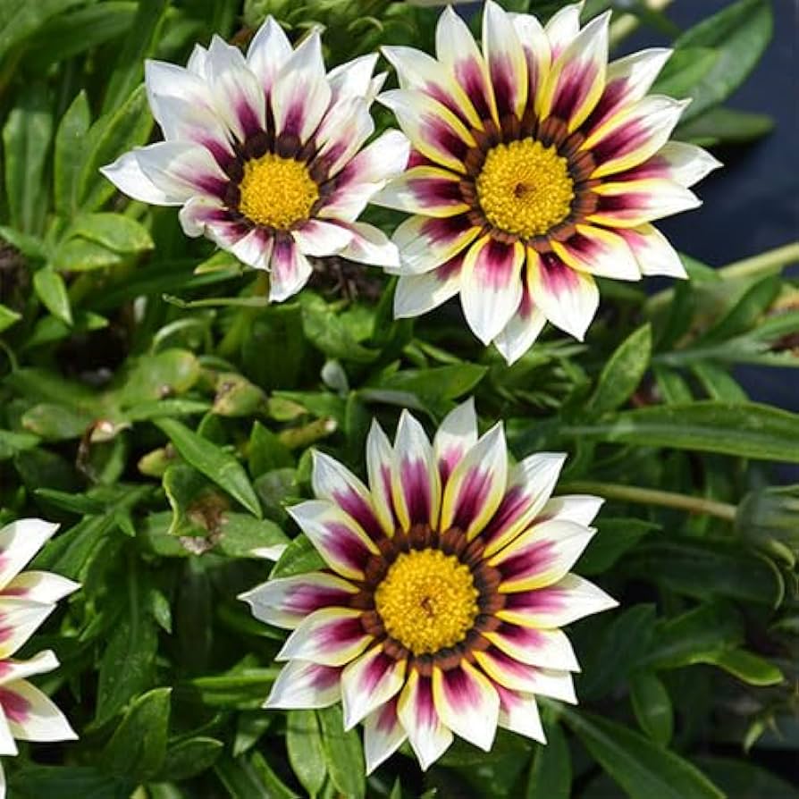 Gazania Treasure Flowers are good plants for the front of sunny garden borders and also perform well as a flowering ground cover when planted in large groups. Because of their heat and drought tolerance, Kiss Gazanias are especially useful near driveways and sidewalks. They also do well in mixed container plantings, pots, baskets and window boxes as well. Gazania are known for closing their flowers at night and on cloudy days, but this Kiss series produces blooms that stay opened more so that you can enjoy them more! Heat and drought tolerant plants once established.