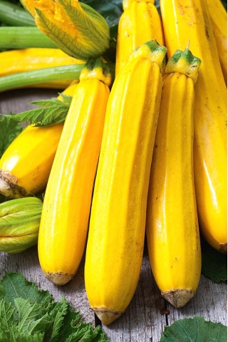 Zucchini "Orelia F1" (Cucurbita pepo var. giromontina) is an early heterotic variety that produces yellow, slender fruit. This highly productive plant has gained on popularity among the gardeners with its compact habit, that makes caring for it and harvesting its crops easier. The extremely long (up to 25 cm) "Orelia F1" fruit take on cylindrical shape and are covered with lemony-yellow peel that shelters firm, delicious flesh. These appetizing zucchinis are used in the kitchen in many ways. You may serve them in slices, fried, boiled or roasted, but they are also fitted for stuffing. They stay digestive, rich in valuable minerals and vitamins (particularly beta-carotene and B vitamins) in any form.