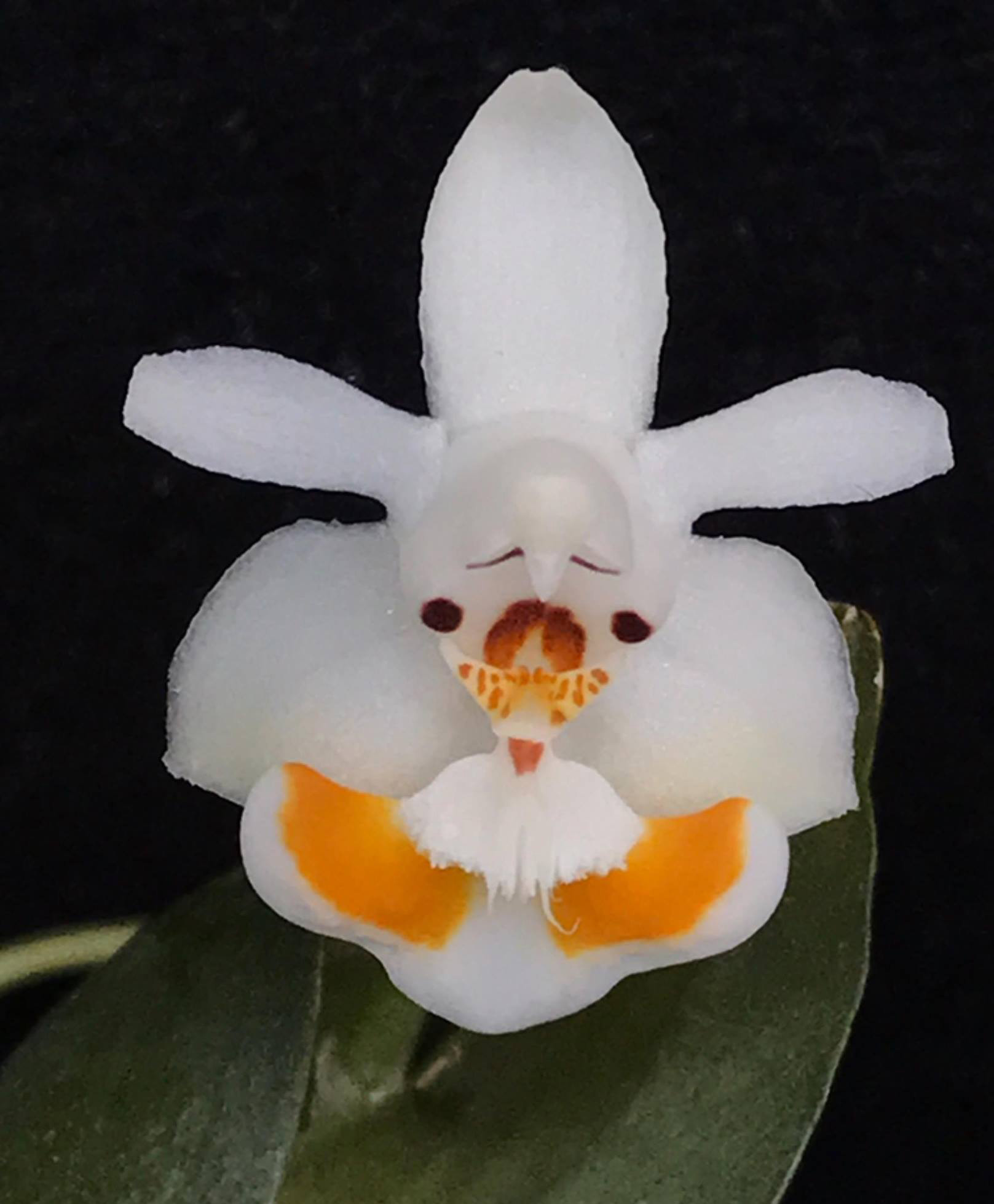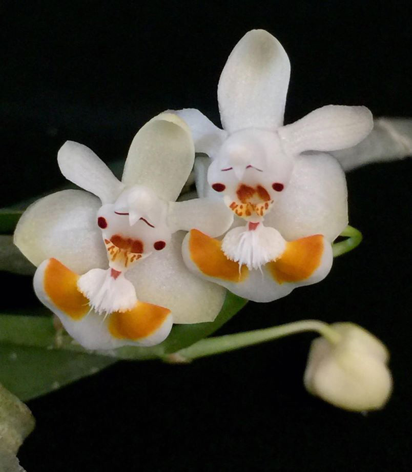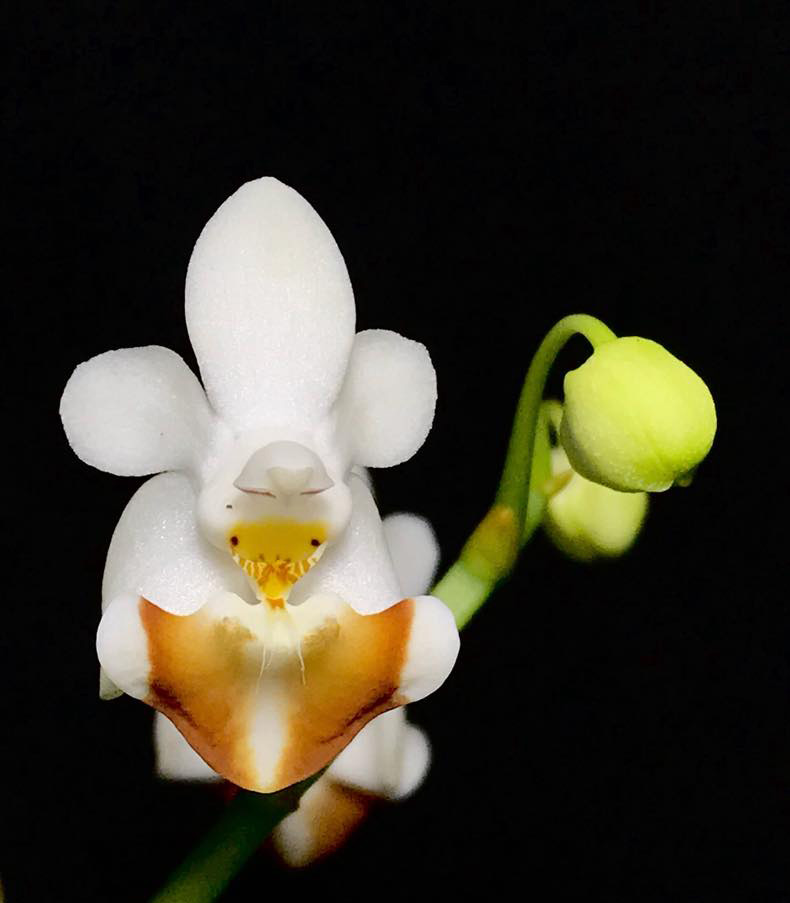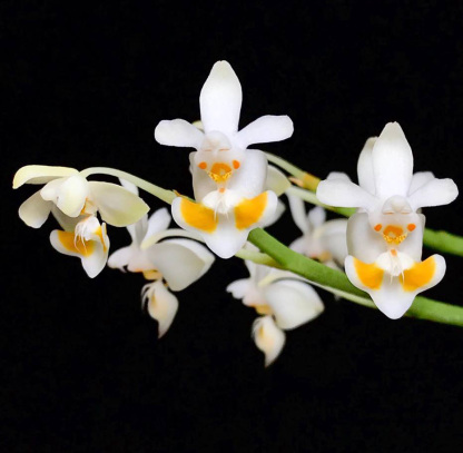 Small Phalaenopsis growth habit with two to three oval 1 to 2 inch leaves – thick flat roots cling to substrate –short inflorescences from base of plant carry two to eight white flowers with showy caramel striped lip
