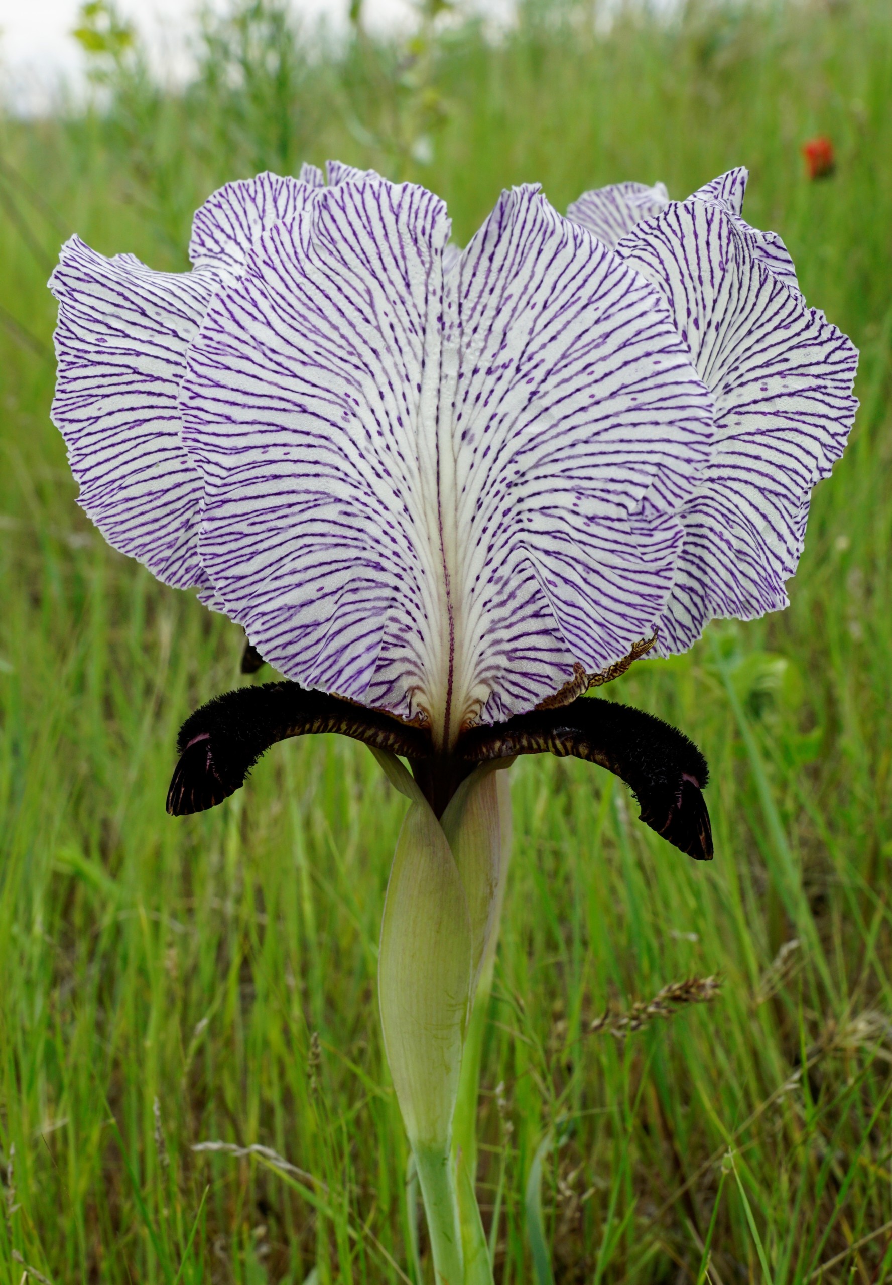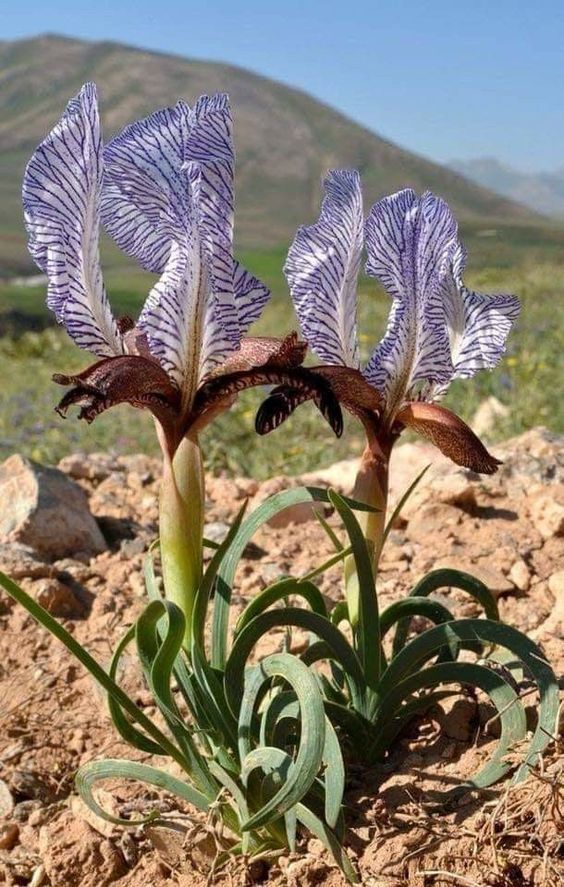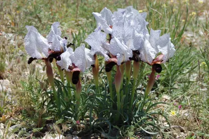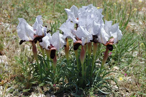 Iris iberica is a plant species in the genus Iris, it is also in the subgenus Iris and in the section Oncocyclus. It is a rhizomatous perennial, from the Caucasus mountains of Armenia, eastern Georgia, and western Azerbaijan. It has narrow, glaucous, gray-green and sickle shaped leaves, short stem holding a single flower in late spring. Which has a pale background (white, cream or pale blue) covered with heavy veining in pale mauve, violet, dark purple, maroon or purple-brown. It has a black or dark purple signal patch and a brown or purple-brown beard. Although, it has many hybrid forms dues to its variability and has 2 known subspecies of Iris iberica subsp. elegantissima and Iris iberica subsp. lycotis. It is cultivated as an ornamental plant in temperate regions, as it is hardier than other Oncocyclus species. It is similar to Iris susiana, apart from its leaf and flower form.It is classed as an Mezo-xerophyte,(meaning they like intermediate dry conditions.) or xeric species (similar to Seseli grandivittatum, Thymus tiflisiensis, Scorzonera eriosperma and Tulipa eichleri). It has a slender, and compact rhizome, that is not stoloniferous, but up to 1.5 cm in diameter. They have 4–6 leaves, that are glaucous, grey-green,and falcate, (sickle shaped) or curved.They can grow up to between 7.5–15 cm (3–6 in) long, and are narrow, being between 0.2 and 0.6 cm wide. The leaves start to grow in Autumn (near to September), after a summer rest period after flowering. It has a short, slender stem or peduncle, that can grow up to between 15–20 cm (6–8 in) tall. The stem has a green, lanceolate, membranous, spathes (leaves of the flower bud), which are variable is size, between 3mm, to 5 cm long. The stems hold a solitary, terminal (top of stem) flower, blooming in late spring, between March and May. In the UK, it blooms later between May and June: 192 The flowers can last between 120 and 145 days before fading. The flowers are 10–15 cm (4–6 in) in diameter, they are described as big and flouncy. The very variable, bi-coloured flowers,have a white, silvery white cream,or pale bluish background,with heavily stippled, spotted or veined in pale mauve, violet, dark purple, maroon, or purple-brown.Some forms can have a lilac background.