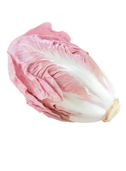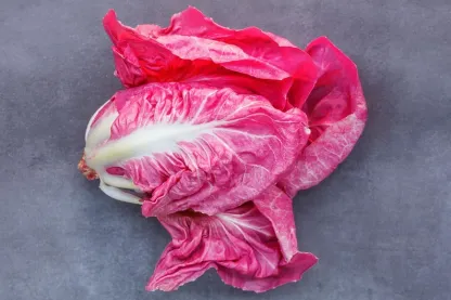 La Rosa del Veneto radicchio is a full, loose head made up of many layers of thin, pink leaves connected to a single, white base. The leaves are smooth, soft, crisp, and are primarily known for their unusual, light pink coloring. In the center of each leaf, a prominent mid-rib extends from the base of the head and spreads out into smaller veins across the leaf’s surface. The white mid-rib has a firm, crunchy, and aqueous consistency. La Rosa del Veneto radicchio, depending on cultivation methods, generally has a crisp, silky texture similar to butter lettuce and is known for its sweeter taste in comparison to other radicchio varieties. Along with its sweeter characteristics, the variety still maintains a sharp, subtle bitterness with light floral notes.